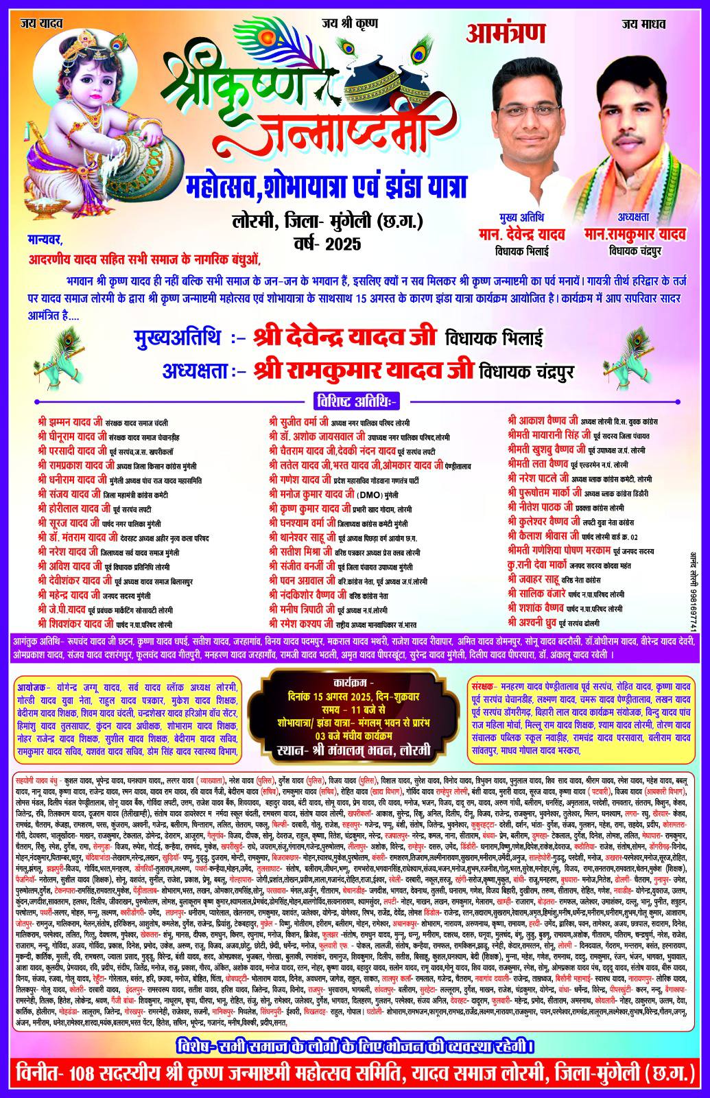 14 अगस्त 2025 मुंगेली/बिलासपुर- लोरमी सर्व यादव समाज 15 अगस्त को धूमधाम से मनायेगा श्री कृष्ण जन्माष्टमी यादव समाज के वरिष्ठ श्री बिहारी लाल यादव जी ने बताया कि हर साल की तरह इस साल भी बड़े हर्षोल्लास के साथ श्री कृष्ण जन्माष्टमी पर्व मनाया जाएगा जिसमे भिलाई विधायक श्री देवेंद्र यादव मुख्य अतिथि अथिति और कार्यक्रम की अध्यक्षता श्री राम कुमार यादव चंद्रपुर विधायक करेंगे समाज के लोगो मे हर्ष व्यप्त हैं ज्ञात हो कार्यक्रम में झाँकी रथ यात्रा और झंड़ा यात्रा जो लोरमी मंगलम भवन से होकर मेन रोड से राधा कृष्ण मंदिर से मुंगेली रॉड होते हुए मंगलम भवन वापसी होगा।