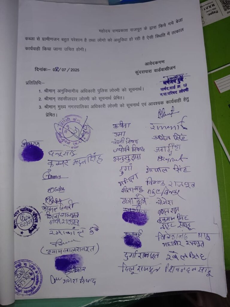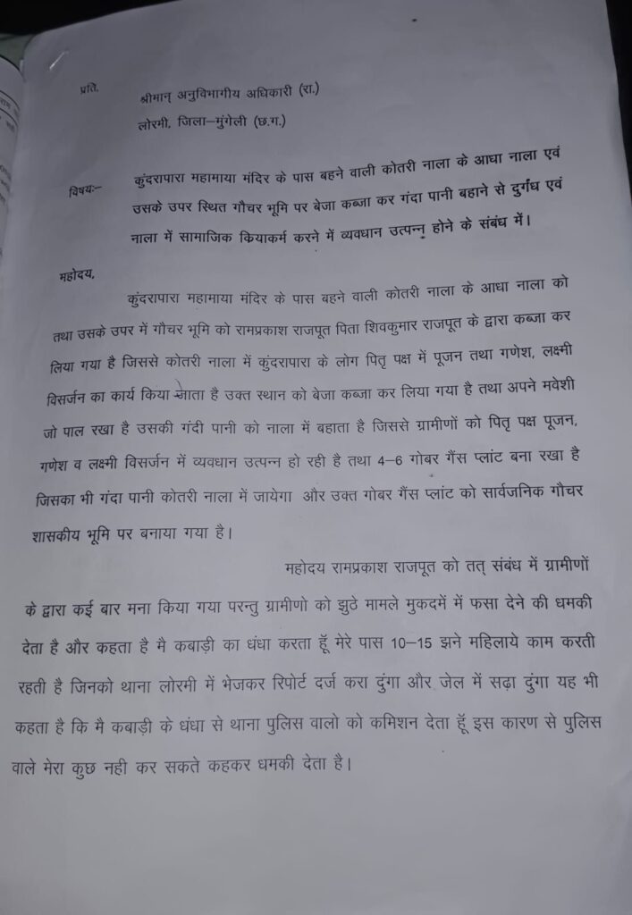 लोरमी 26 अगस्त 2025- कुंदरापारा महामाया मंदिर के पास बहने वाली कोतरी नाला और गौचर भूमि पर रामप्रकाश राजपूत द्वारा बेजा कब्जा करने और वहां बने गोबर गैस प्लांट से गंदा पानी नाले में बहाने की शिकायत वार्ड वासियों ने की है।