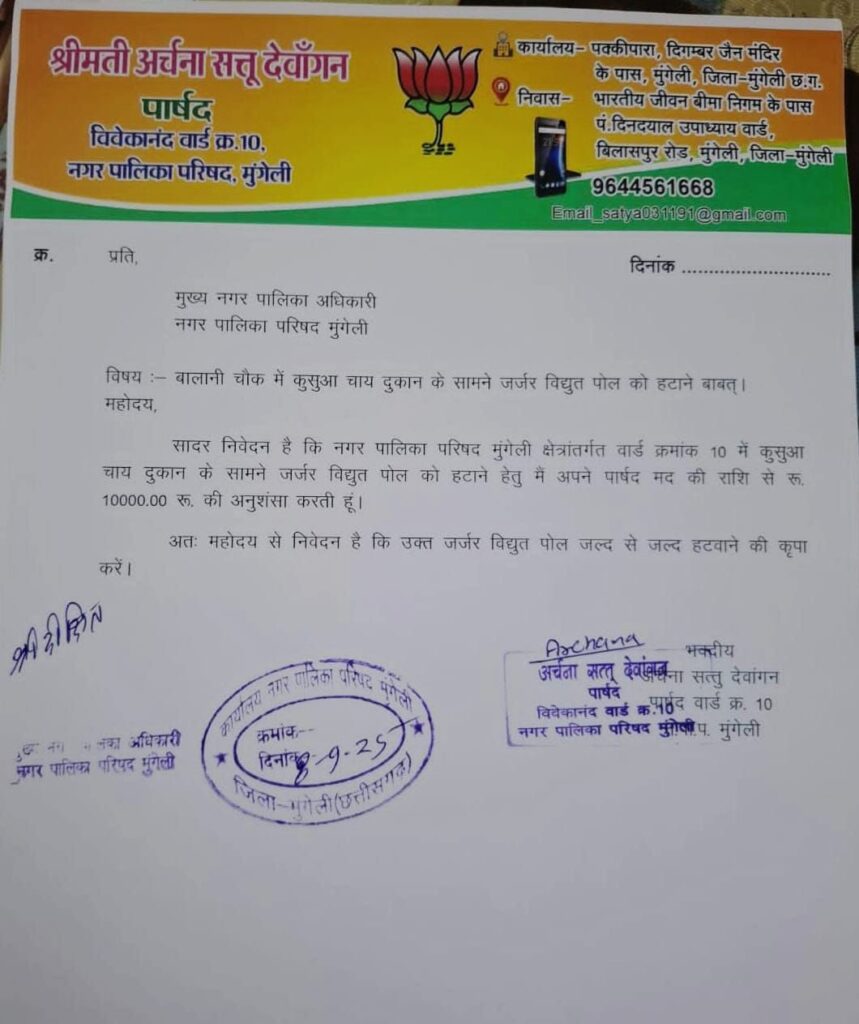 विवेकानंद वार्ड की पार्षद श्रीमती अर्चना सत्तू देवांगन ने इस गंभीर समस्या को लेकर पहल की है। उन्होंने बालानी चौक के पास लगे खतरनाक पोल को हटाने के लिए अपने पार्षद मद से 10,000 रुपये स्वीकृत किए हैं। पार्षद प्रतिनिधि सत्तू देवांगन ने जानकारी दी कि इस संबंध में मुख्य नगर पालिका अधिकारी को पत्र लिखकर तत्काल कार्रवाई की मांग की गई है। पत्र में कहा गया है कि कुसुवा चाय दुकान के सामने खड़ा यह पोल किसी भी समय गिर सकता है और आसपास के लोगों की जान को खतरा है।