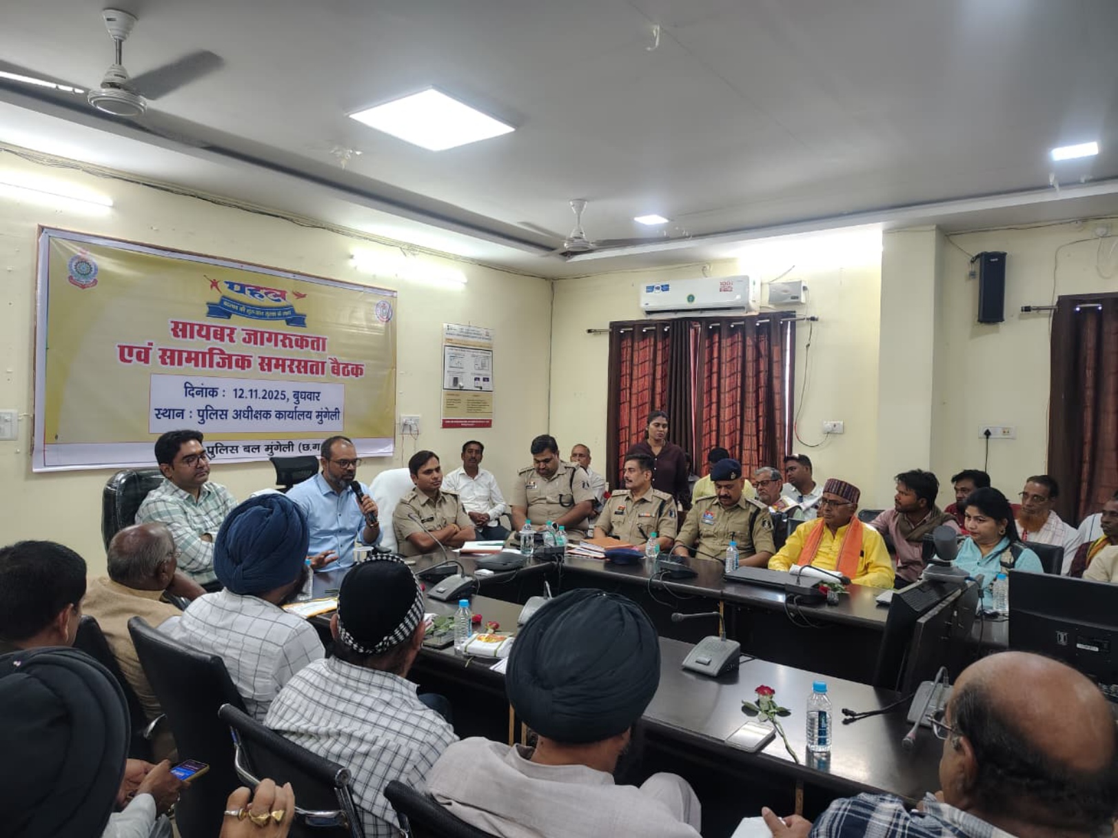 गुरुवार 13 नवम्बर 2025 – जिला पुलिस अधीक्षक कार्यालय से मिली जानकारी मुंगेली सामाजिक समरसता और जनजागरूकता बढ़ाने के उद्देश्य से जिला कलेक्टर कुंदन कुमार एवं पुलिस अधीक्षक भोजराम पटेल के निर्देशन में “पहल” अभियान के तहत पुलिस अधीक्षक कार्यालय के संवाद सभा कक्ष में सर्व समाज प्रमुखों की बैठक आयोजित की गई।