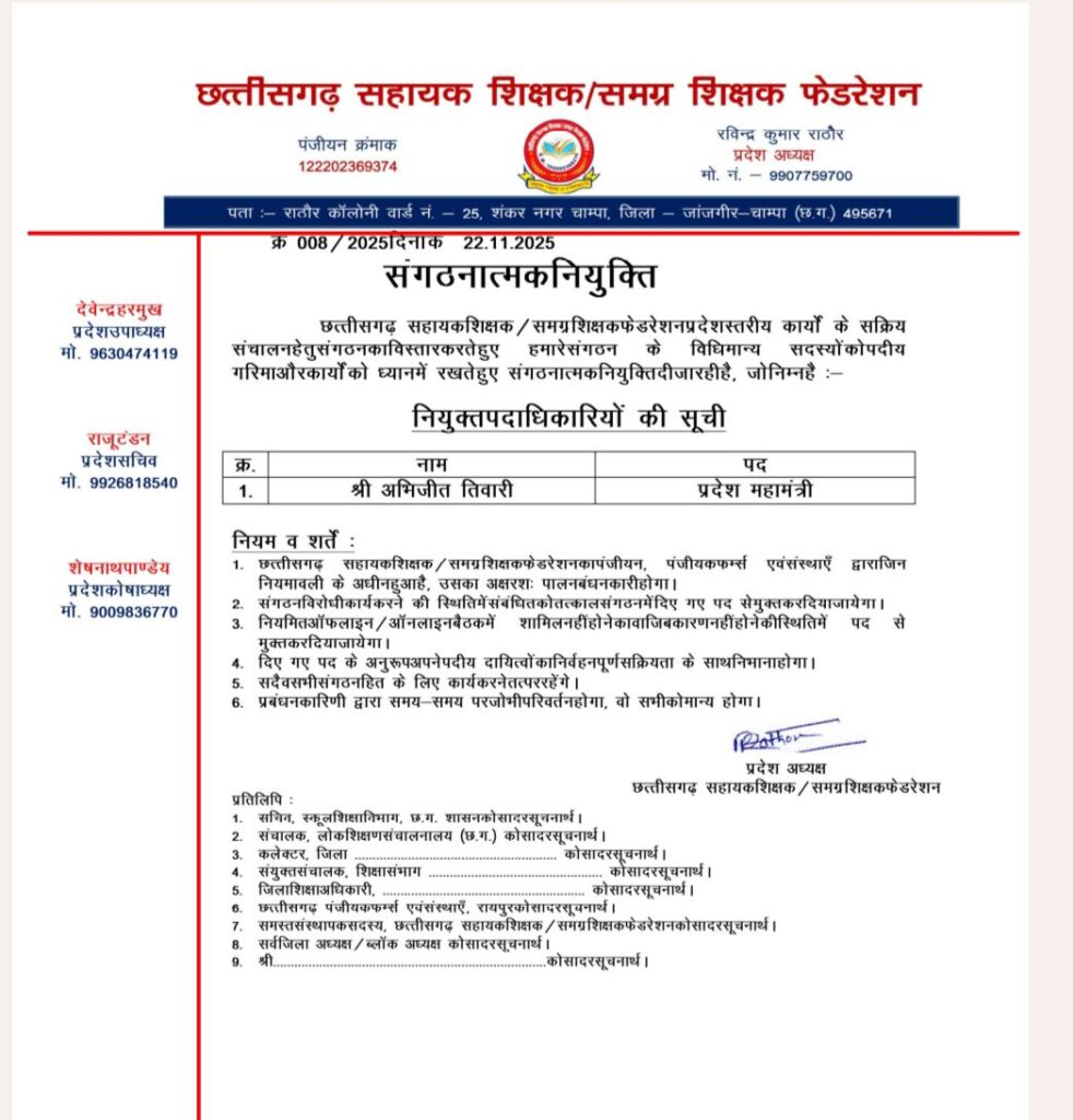 छत्तीसगढ़ सहायक शिक्षक समग्र शिक्षक फेडरेशन की नई प्रदेश कार्यकारिणी घोषित कर दी गई है। नवनिर्वाचित प्रदेश अध्यक्ष रविंद्र राठौर और प्रदेश संयोजक मनीष मिश्रा ने मुंगेली जिले से दो शिक्षकों को प्रांतीय टीम में जगह दी है।