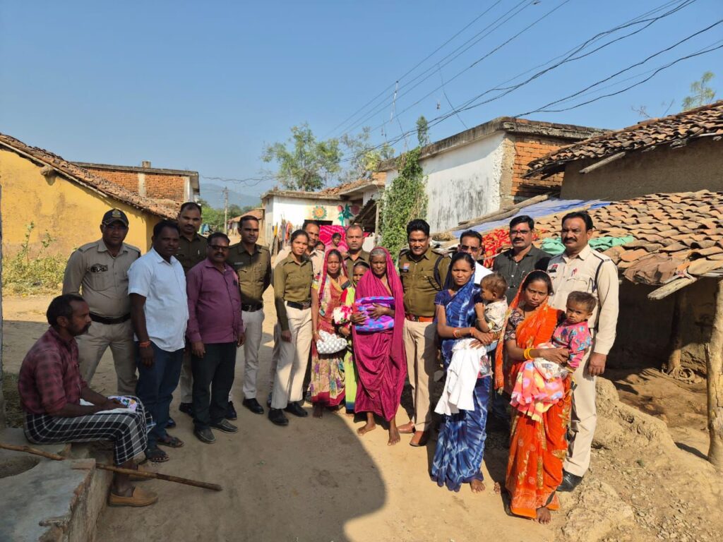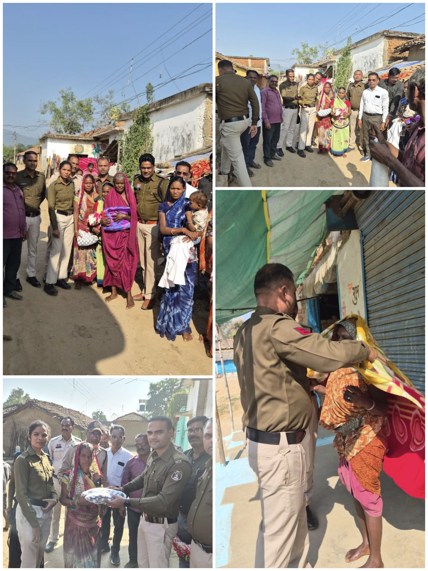 सुबह-सुबह पुलिस टीम ने ग्रामीणों और बच्चों को गर्म कपड़े, साल, कंबल और बच्चों के वस्त्र वितरित किए, जिससे स्थानीय लोगों में राहत और भरोसे का वातावरण बना।