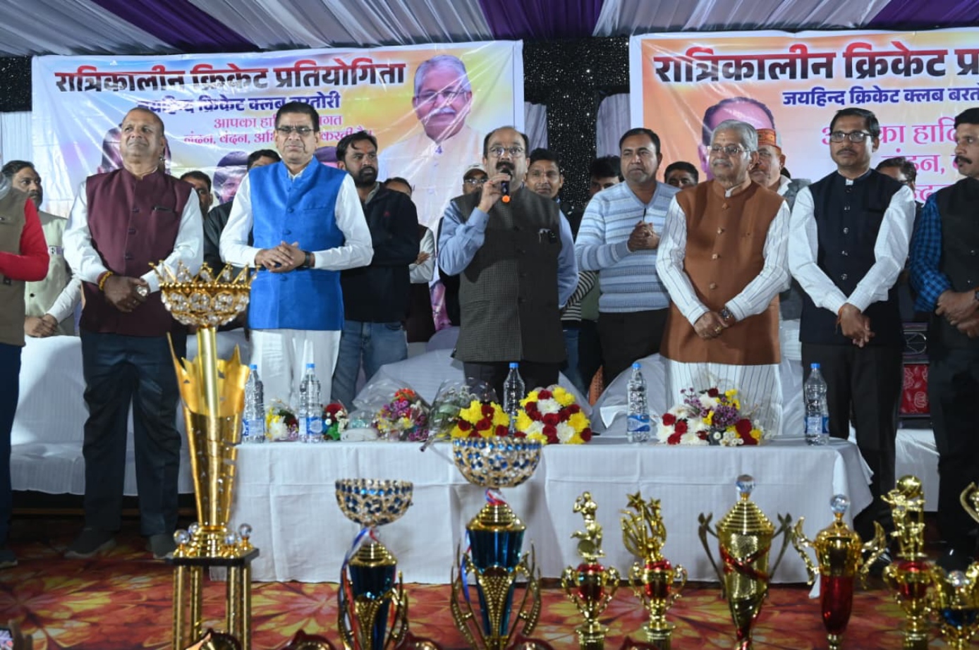 बिल्हा/बिलासपुर – 10 दिसंबर 2025 – बिल्हा विधानसभा के ग्राम बरतोरी में जयहिंद क्रिकेट क्लब द्वारा आयोजित रात्रिकालीन क्रिकेट प्रतियोगिता के फाइनल मुकाबले में मंगलवार को उप मुख्यमंत्री अरुण साव शामिल हुए। उन्होंने खिलाड़ियों और उपस्थित खेल प्रेमियों को संबोधित करते हुए कहा कि क्रिकेट आज देश का सबसे लोकप्रिय खेल है और गांव-गांव में हो रही प्रतियोगिताएं युवाओं के खेल के प्रति बढ़ते जुनून का प्रमाण हैं।