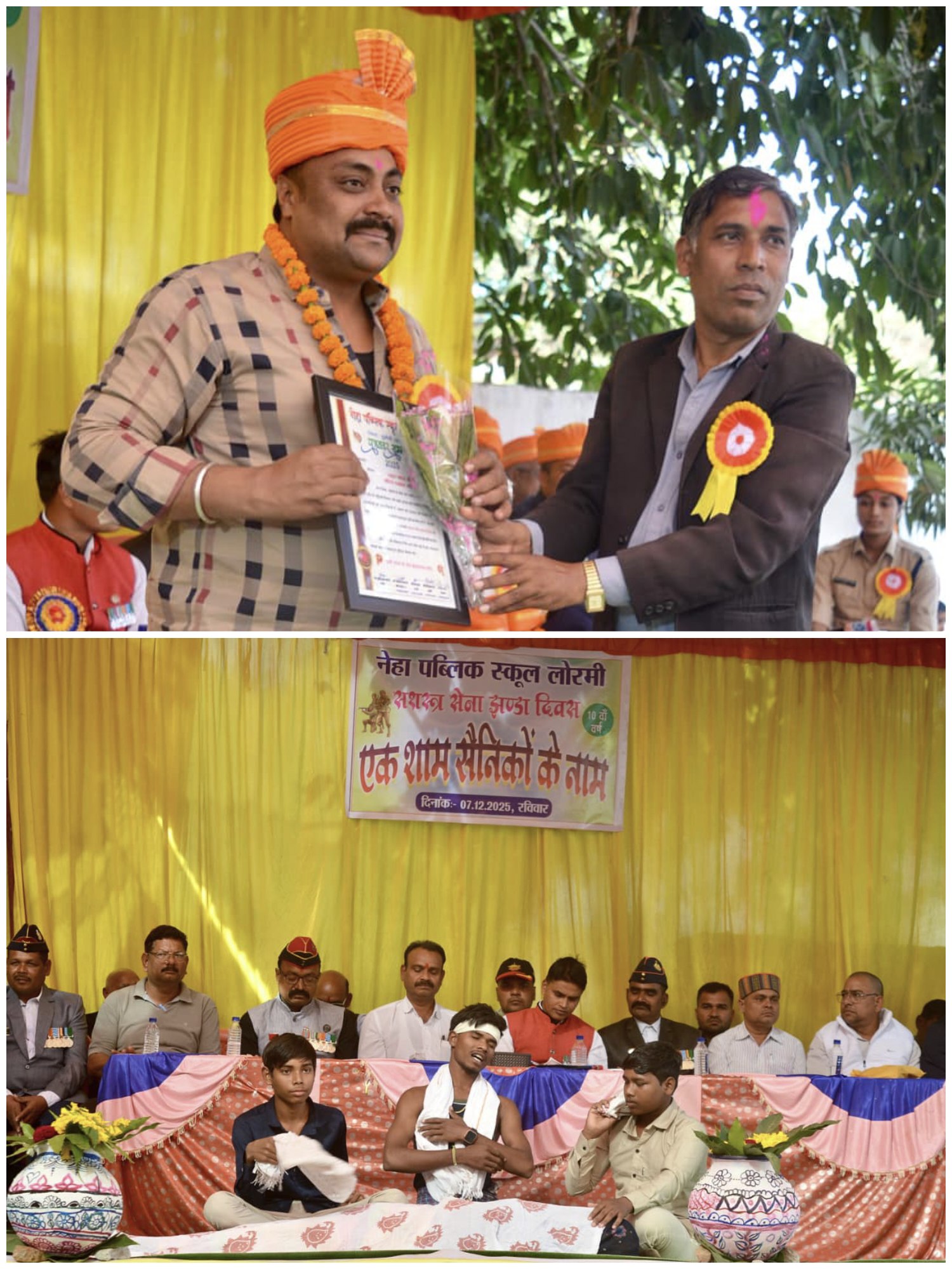 लोरमी। नेहा पब्लिक स्कूल लोरमी में सशस्त्र सेना झंडा दिवस के अवसर पर लगातार दसवें वर्ष “एक शाम सैनिकों के नाम” कार्यक्रम का भव्य आयोजन किया गया। कार्यक्रम के मुख्य अतिथि नगर पालिका परिषद अध्यक्ष सुजीत कुमार वर्मा रहे। उन्होंने अपने संबोधन में भारतीय सैनिकों की वीरता, त्याग और देशभक्ति को नमन करते हुए कहा कि “हम चाहे जितना भी सम्मान दें, वह वीर सैनिकों के समर्पण के सामने कम है।”