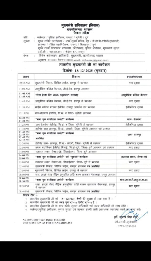 माननीय मुख्यमंत्री श्री विष्णु देव साय का गुरुवार 18 दिसंबर 2025 को रायपुर, मुंगेली एवं दुर्ग जिलों का विस्तृत दौरा कार्यक्रम निर्धारित है। मुख्यमंत्री सचिवालय से जारी फैक्स संदेश के अनुसार मुख्यमंत्री जी दिनभर विभिन्न सामाजिक, स्वास्थ्य एवं धार्मिक कार्यक्रमों में शामिल होंगे।