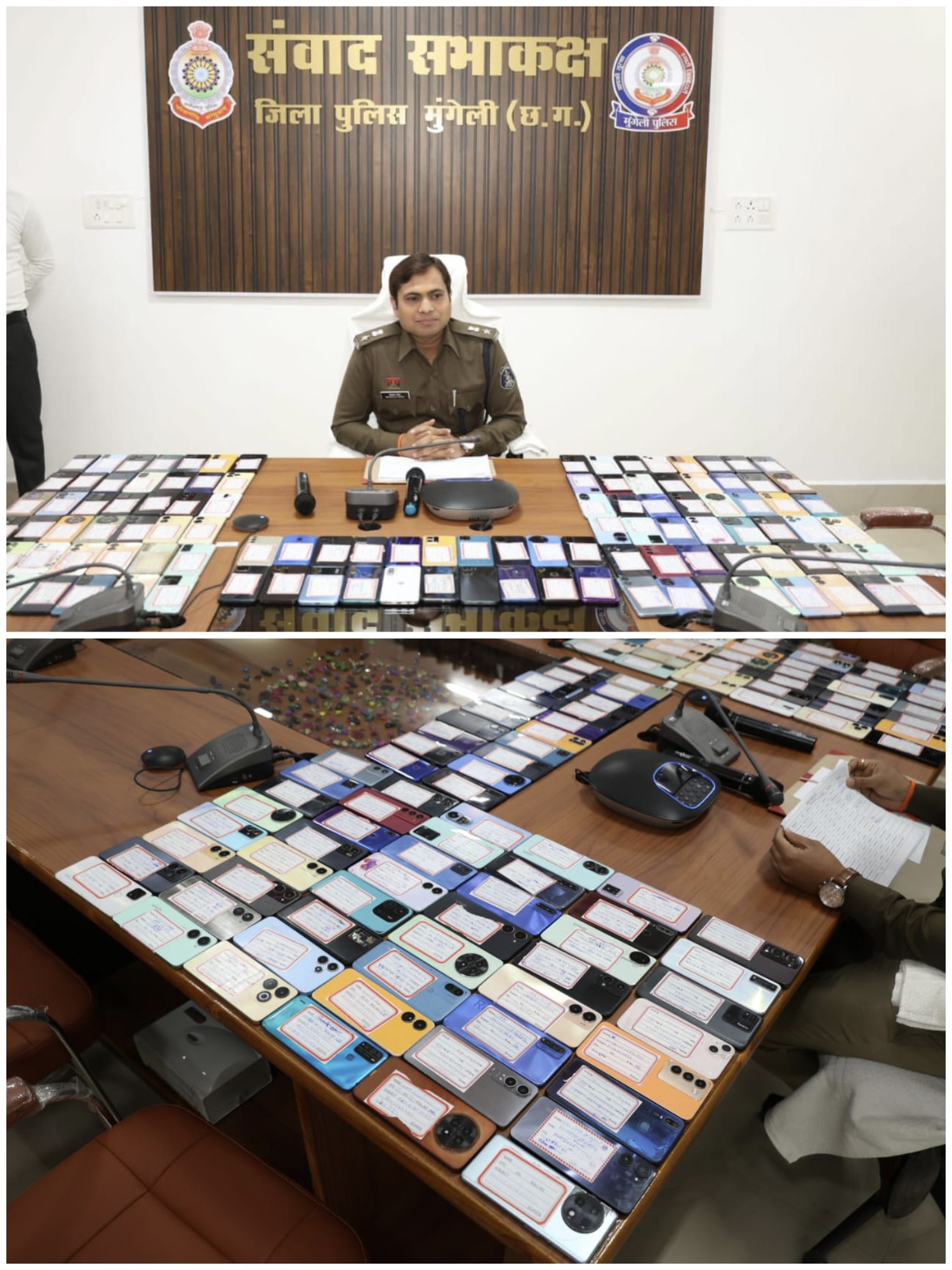 पुलिस अधीक्षक श्री भोजराम पटेल के निर्देशन में मुंगेली पुलिस ने ‘गुम मोबाइल खोज अभियान’ के तहत बड़ी सफलता हासिल की है। वर्ष के अंतिम दिन विभिन्न जिलों व राज्यों से बरामद 110 मोबाइल फोन (मूल्य लगभग 16.50 लाख रुपये) उनके rightful मालिकों को सौंपे गए।