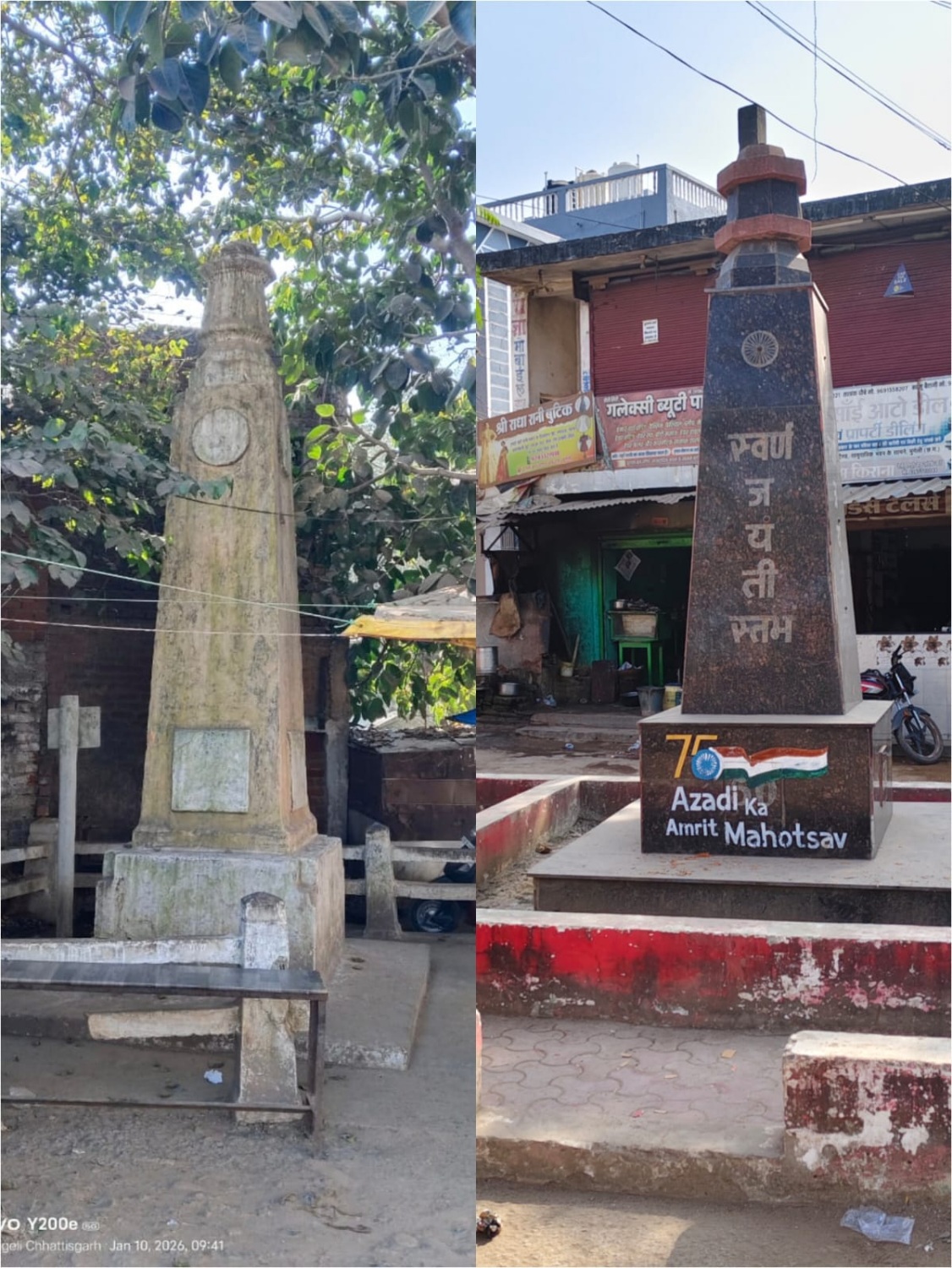 नगर पालिका परिषद मुंगेली के सरदार पटेल वार्ड क्रमांक–02 में स्थित आजादी के प्रतीक रजत जयंती स्तंभ और स्वर्ण जयंती स्तंभ इन दिनों अपनी ही पहचान खोते नज़र आ रहे हैं। जिन स्मारकों को स्वतंत्रता की याद में सम्मान का स्थान दिया गया था, वे आज अतिक्रमण, गंदगी और लापरवाही की मार झेल रहे हैं।