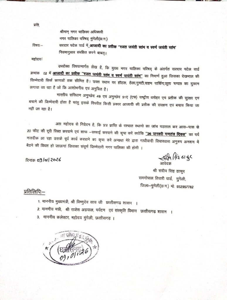 आजादी के प्रतीक बने उपेक्षा के शिकार! सरदार पटेल वार्ड में अतिक्रमण का अड्डा, युवा ने सौंपा ज्ञापन—गणतंत्र दिवस से पहले कार्रवाई की मांग