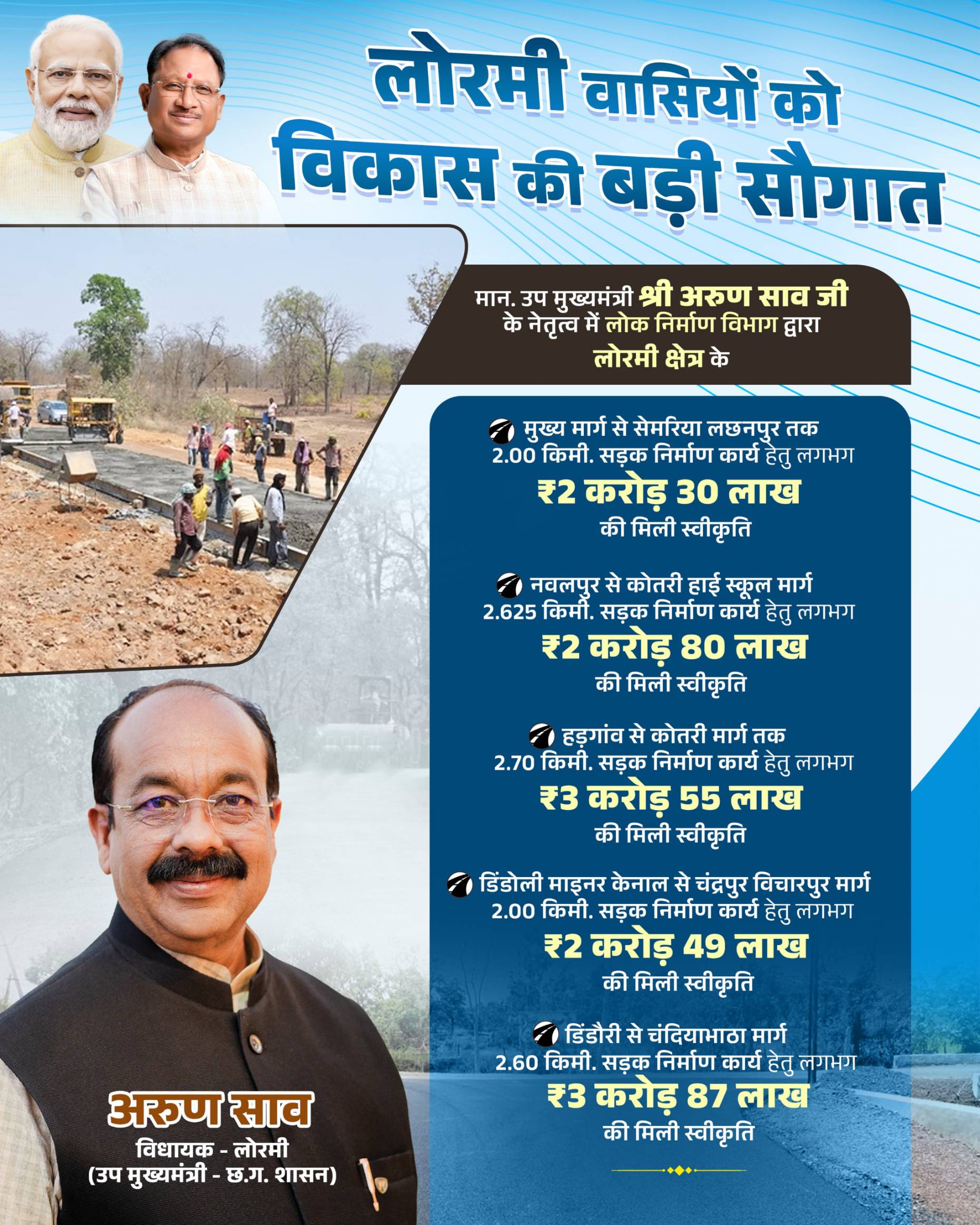छत्तीसगढ़ के डिप्टी सीएम एवं लोरमी विधायक अरुण साव लगातार क्षेत्र के विकास कार्यों को गति दे रहे हैं। इसी क्रम में उन्होंने लोरमी विधानसभा क्षेत्र की पाँच महत्वपूर्ण सड़कों के निर्माण हेतु 15 करोड़ 59 हजार रुपये की प्रशासकीय स्वीकृति प्रदान की है। इन सड़क निर्माण कार्यों के पूरा होने से ग्रामीण क्षेत्रों में आवागमन और भी सुगम होगा।