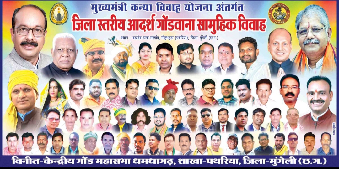 मुख्यमंत्री कन्या विवाह योजना के अंतर्गत आज जिला मुंगेली के पथरिया विकासखंड अंतर्गत सरगांव स्थित बड़ादेव पेन ठाना, मोहभट्ठा में जिला स्तरीय आदर्श गोंडवाना सामूहिक विवाह का भव्य आयोजन किया जा रहा है। यह आयोजन केन्द्रीय गोंड महासभा के तत्वावधान में हो रहा है, जिसमें जिले भर से बड़ी संख्या में मातृशक्ति, पितृशक्ति एवं युवा शक्ति के शामिल होने की उम्मीद है।