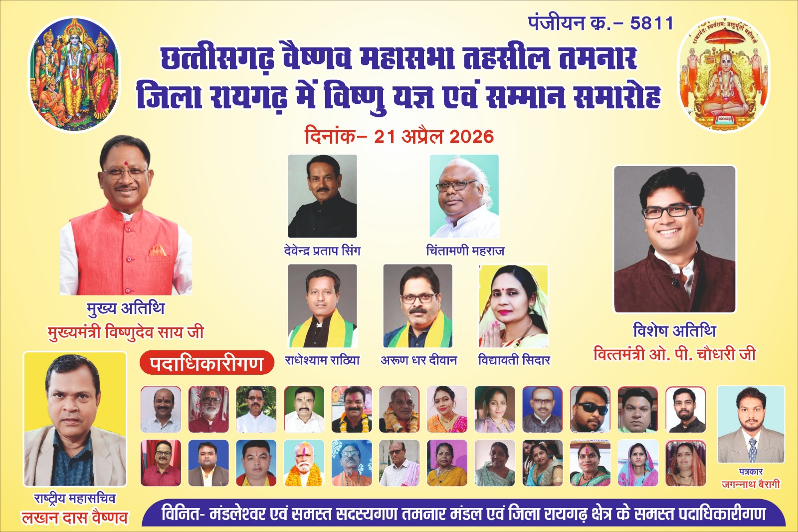 वैष्णव समाज के राष्ट्रीय एवं प्रांतीय स्तर के कई प्रमुख पदाधिकारी भी इस आयोजन में शामिल होंगे। इनमें राष्ट्रीय अध्यक्ष जयन्ती भाई वैष्णव, ट्रस्ट मुंबई के राष्ट्रीय अध्यक्ष रामचंद्र वैष्णव, राष्ट्रीय महासचिव लखन दास वैष्णव प्रमुख हैं।